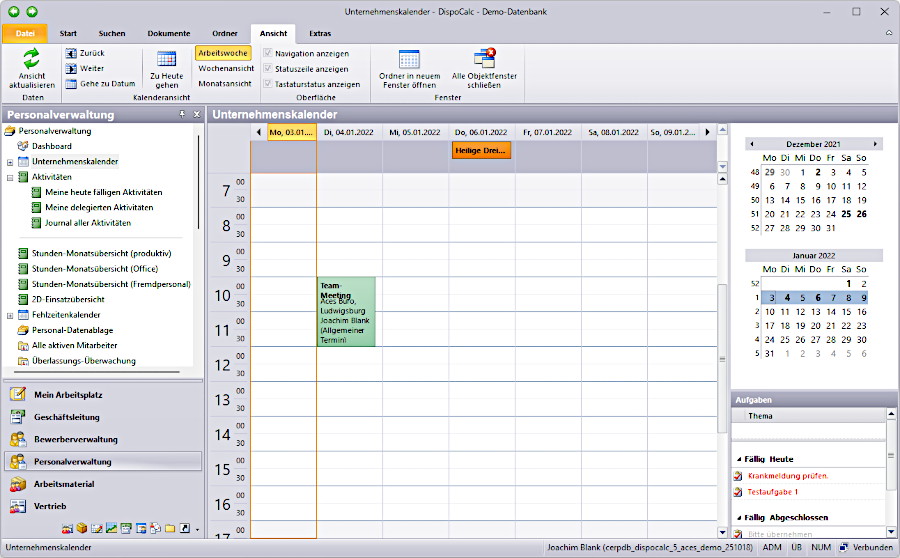 Der Unternehmenskalender ist ein Ordner, der standardmäßig in allen Anwendungsbereichen oben in der Ordnerliste angezeigt wird. Er zeigt zusammengefasst alle Termine an, die für Sie wesentlich sind. Neben Terminen, welche als Termin-Aktivität zu einem Objekt eingetragen wurden, werden hier auch von DispoCalc errechnete Termine wie Schulungstage, Wiedervorlagen von Dokumenten oder Objekten, ablaufende Gültigkeiten von Dokumenten, Geburtstage etc. angezeigt. Die folgende Grafik zeigt die Ansicht des Unternehmenskalenders an: