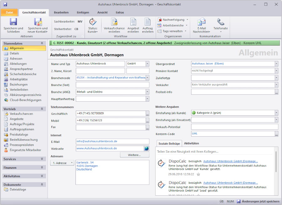 Von Ihnen geöffnete Objekte werden in Objektfenstern angezeigt. Sie können gleichzeitig mehrere Objekte öffnen und die jeweiligen Objektfenster beliebig auf Ihrem Desktop anordnen. Objektfenster beinhalten alle Daten des Objektes, welche in verschiedenen Detailseiten dargestellt werden, die über die am linken Rand sichtbare Seitenleiste ausgewählt werden können. Abhängig von den Ihnen zugewiesenen Benutzerrechten stehen für Sie in einigen Objekten eventuell nicht alle Detailseiten wie hier im Handbuch angegeben zur Verfügung - fragen Sie im Zweifel Ihren Anwendungsadministrator, welchen Zugriff Sie auf die einzelnen Bereiche besitzen. Die folgende Darstellung zeigt ein Objektfenster am Beispiel eines Kundenkontaktes: